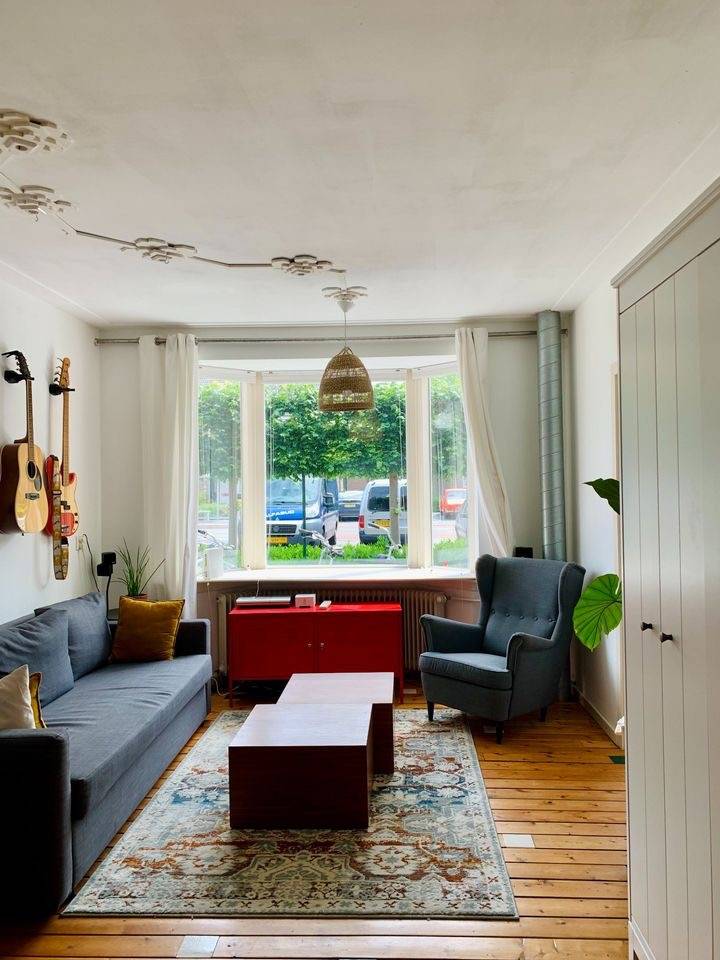De eigen voordeur biedt toegang tot de woonkamer. De lichte woonkamer met aan de voorzijde een erker met drie grote ramen biedt uitzicht op de voortuin, platsoenen en straat. De woonkamer is voorzien van een authentieke houten vloer. De grote woonkamer is ingedeeld in een tv- zithoek aan de voorzijde en een eethoek aan de achterzijde. Door de ruime afmetingen is het mogelijk om een game/studeerhoek te maken.