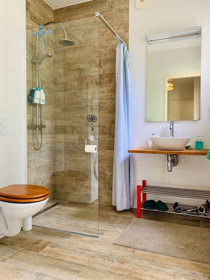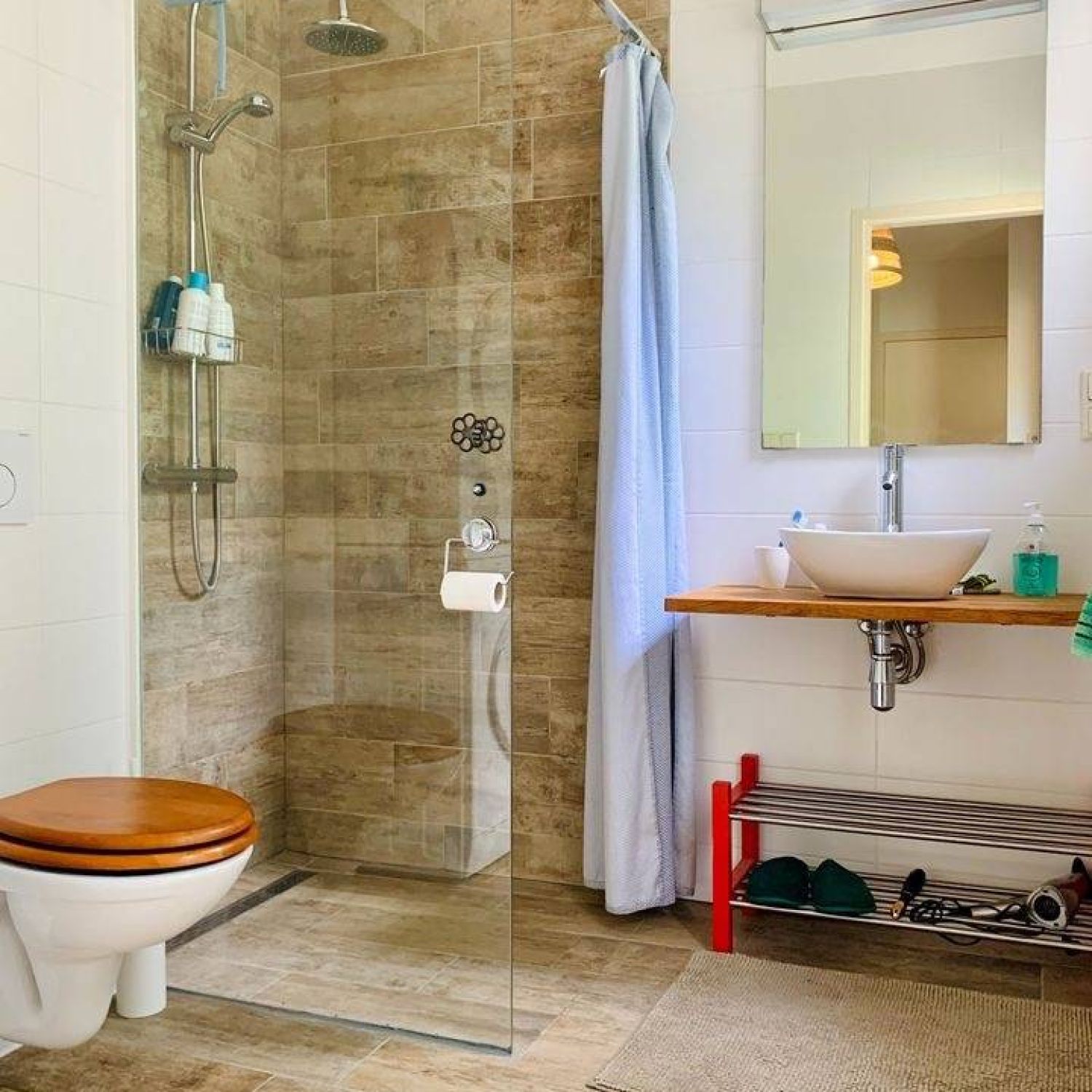 The bathroom is accessible from the kitchen. The bathroom has a tiled floor and wall tiles, a spacious purchase shower with thermostatic mixer tap. The bathroom also contains the washing machine and dryer as well as a sink with mirror and toilet. The garden is also accessible from the bathroom through a wicket door.