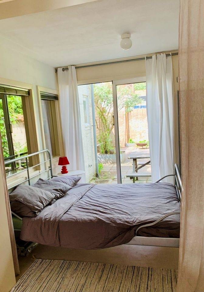 From the living room the bedroom is accessible via an open corridoor with double curtains. The bedroom has a double bed as well as steel wardrobes. The bedroom has a sliding door that provides access to the private garden.