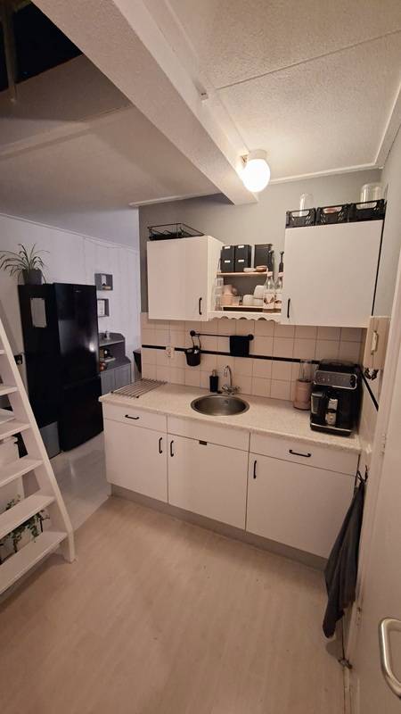 De keuken bestaat uit twee delen. Het eerste deel is voorzien van voldoende boven en onderkasten en gootsteen met mengkraan. In het tweede deel, voor het raam, zitten de kookplaat, koelkast (ter overname) en afzuigkap.