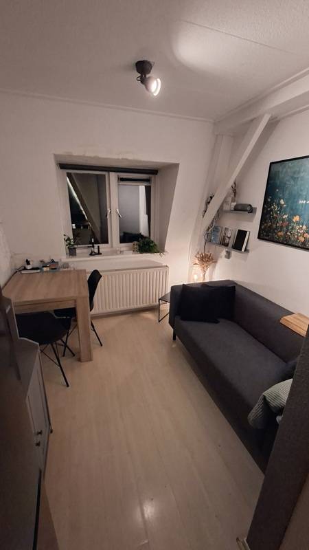 De knusse woonkamer is aan de voorzijde gelegen en biedt plaats voor een tv-hoek. Door het grote dubbele raam is het lekker licht. Door de lichte laminaatvloer wordt dit ook nog versterkt.