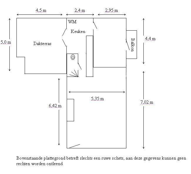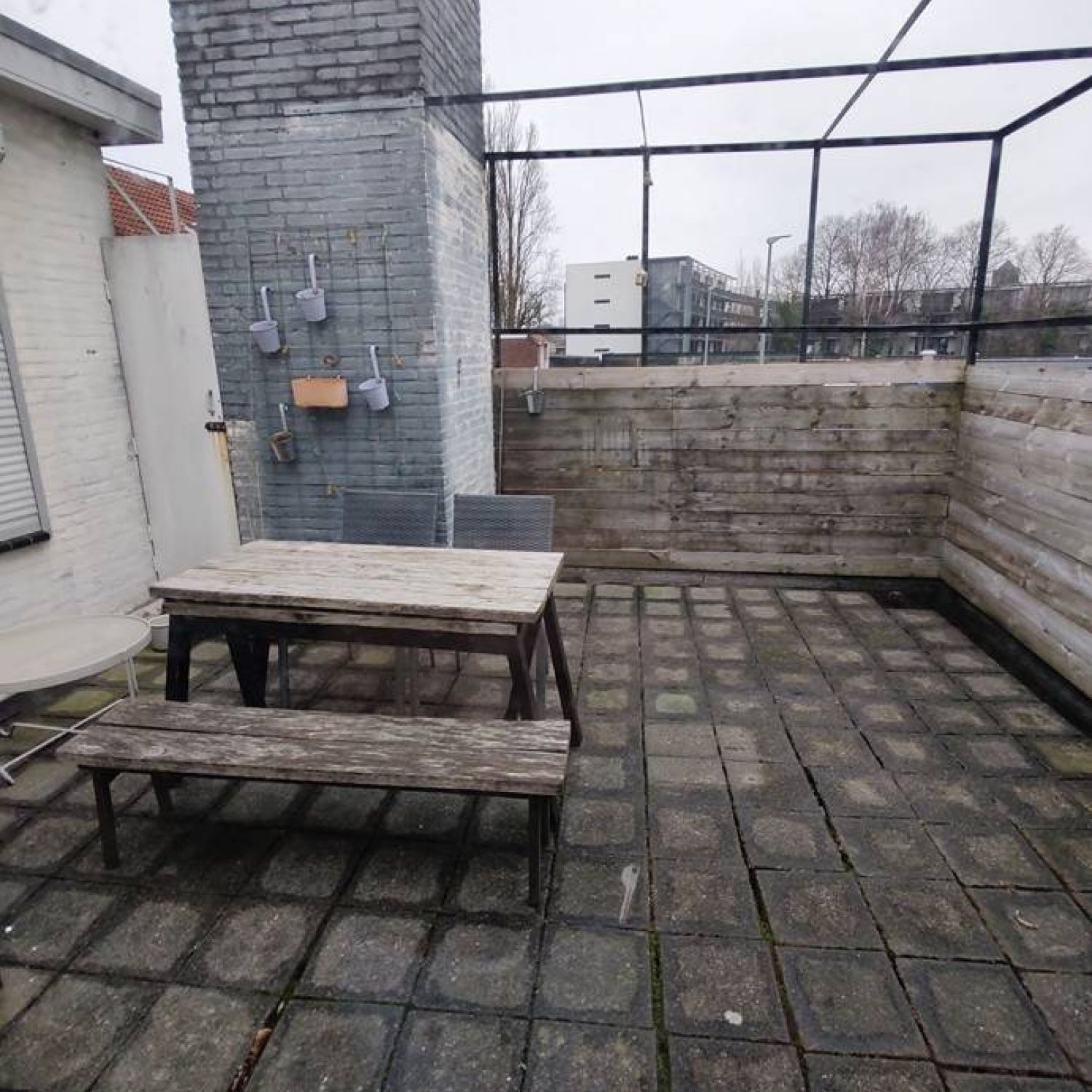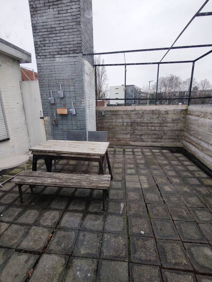 Vanuit de keuken bieden twee openslaande tuindeuren toegang tot het riante terras van ca. 23 m². Het dakterras is volledig omheind en biedt daardoor veel privacy. Vanuit de keuken is tevens de ruime slaapkamer bereikbaar. De slaapkamer heeft als extra een deur naar het eigen balkon aan de voorzijde van de woning. De slaapkamer is voorzien van vloerbedekking (ter overname). De wanden en het plafond zijn in lichte tinten geschilderd. Tevens zijn alle kozijnen voorzien van rolluiken.