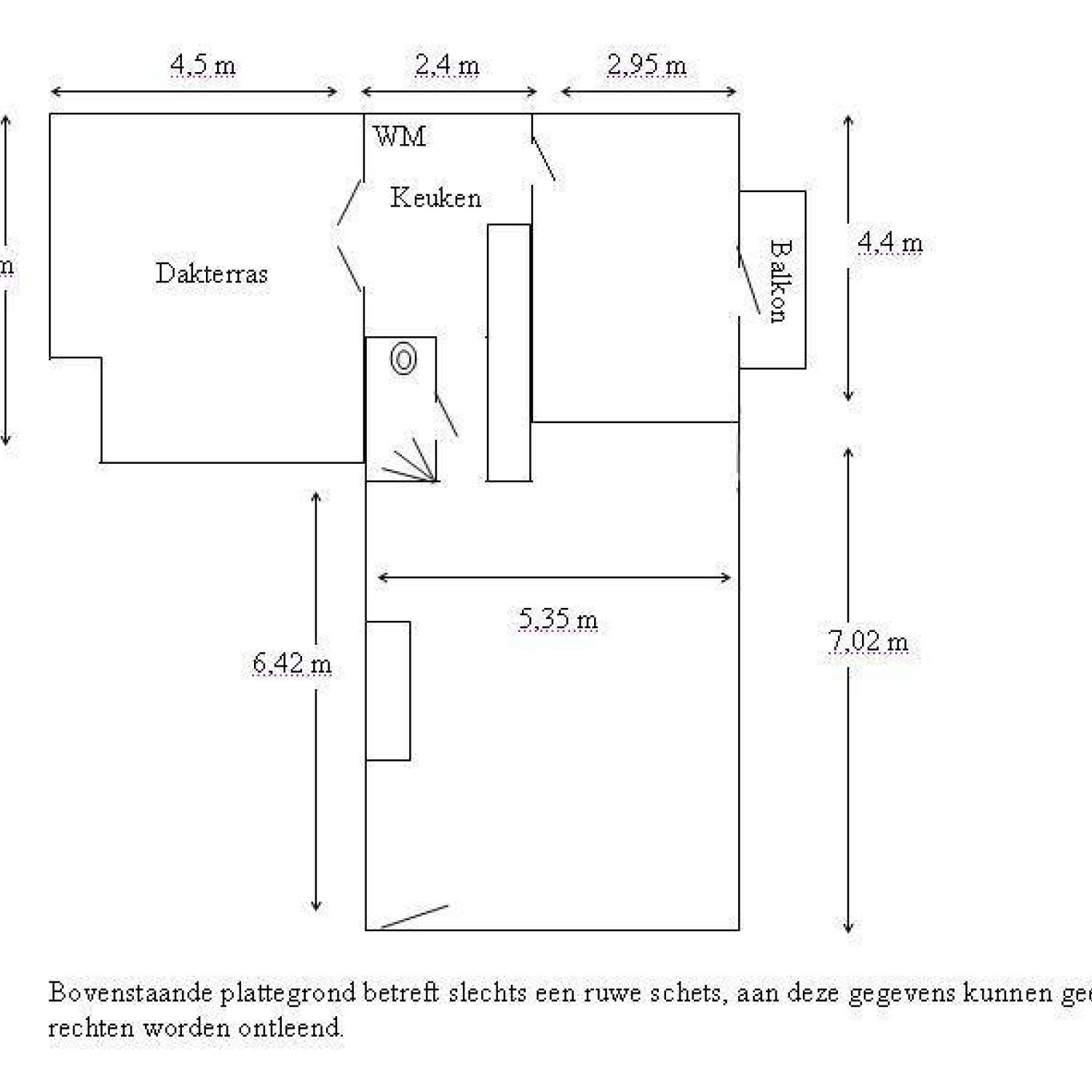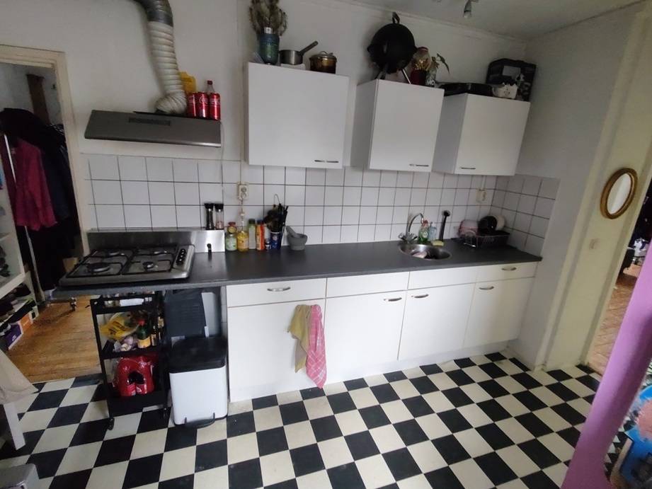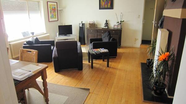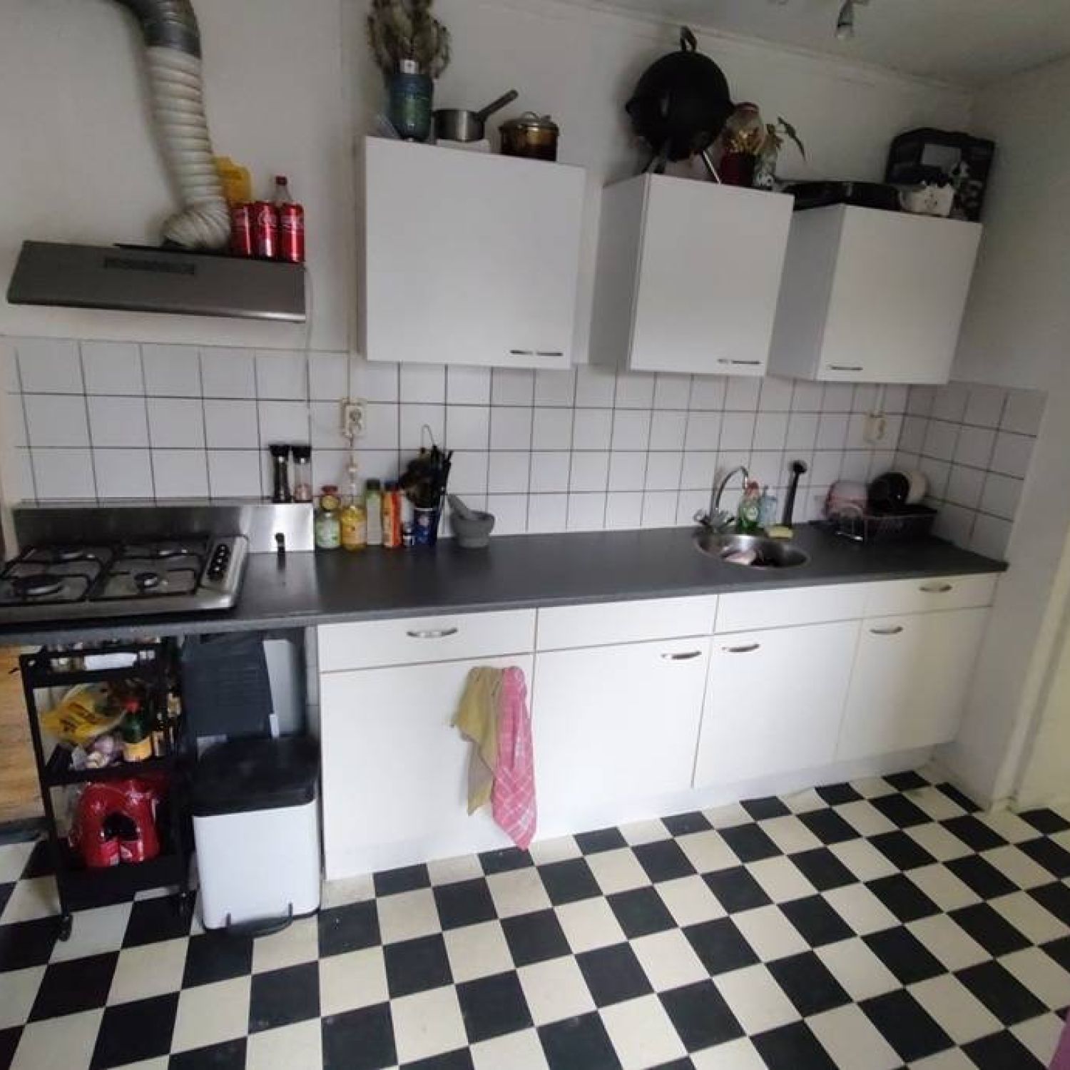Middels een centrale voordeur (voor 2 appartementen) biedt een vaste trap toegang tot de eerste verdieping, alwaar de voordeur van de twee appartementen zich bevinden. De berging van het appartement is gelegen op de begane grond en wordt gedeeld met de andere gebruikers van het complex. De eigen voordeur geeft toegang tot de ruime woonkamer, die vanwege de grote raampartijen lekker licht is. De oppervlakte van de woonkamer is ca. 35 m². Er is ruim voldoende plek voor het plaatsen van een aparte eethoek en een aparte tv-hoek. Vanuit de woonkamer is er een gang naar de keuken, met daaraan gelegen een deur naar het toilet en de douche. De keuken bevat erg veel boven- en onderkastjes. Uiteraard is er een gootsteen met mengkraan aanwezig. De vierpits gaskookplaat is ter overname evenals de koelkast en de vinyl vloerbedekking. In de keuken bevindt zich tevens de aansluiting voor de wasmachine.