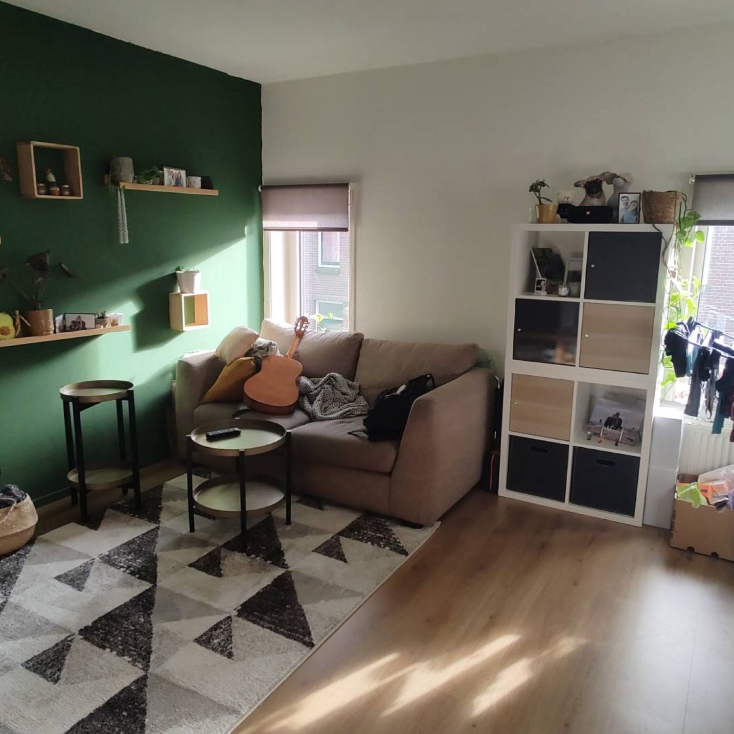 De gehele studio is lekker licht door de aanwezigheid van veel ramen, allen voorzien van kunststof kozijnen met kiep ramen. De studio is verder voorzien van een lichte laminaatvloer. Omdat de studio op de hoek gelegen is geeft dit een ruimtelijk gevoel.